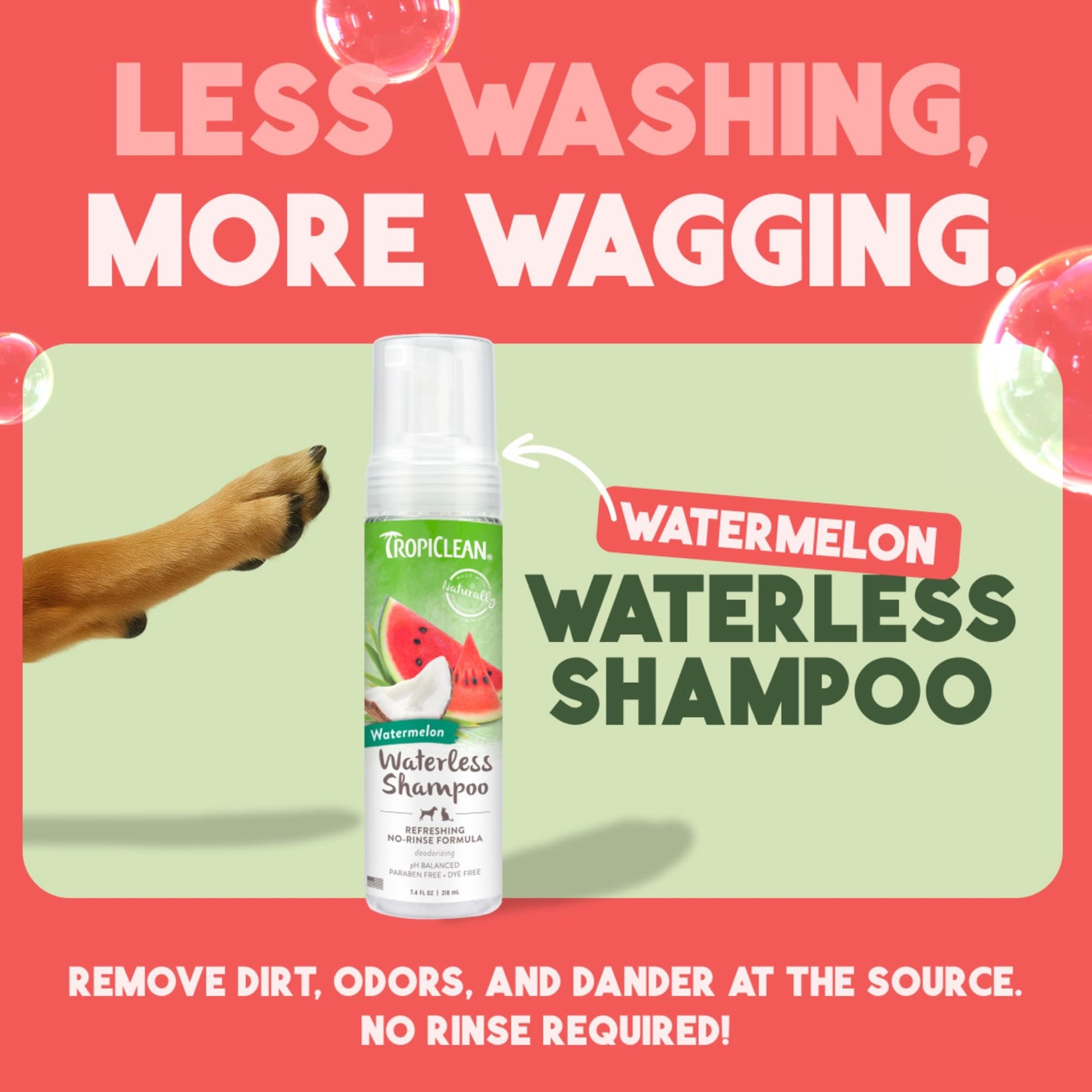 TropiClean Watermelon Waterless Shampoo is enriched with a botanical blend that helps moisturize the pet's skin and coat and provide a refreshing clean between baths. The sweet summer scent of watermelon leaves your pet smelling fresh and ready for cuddles!